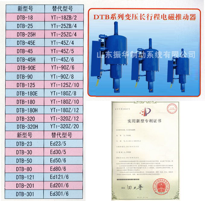 山东振华制动系统有限公司,经过几十年的电磁铁研究,引进比利时先进技术,与中科院枝工程机械、电气委员们精心研制而成的DTB, DTZ, DTF系列交流、直流、交直流共用型变压长行程电磁推动器,它具有以下几大突破传统电磁铁设计的优点,并成为替代YT、Ed、MYT等产品的更新换代产品。